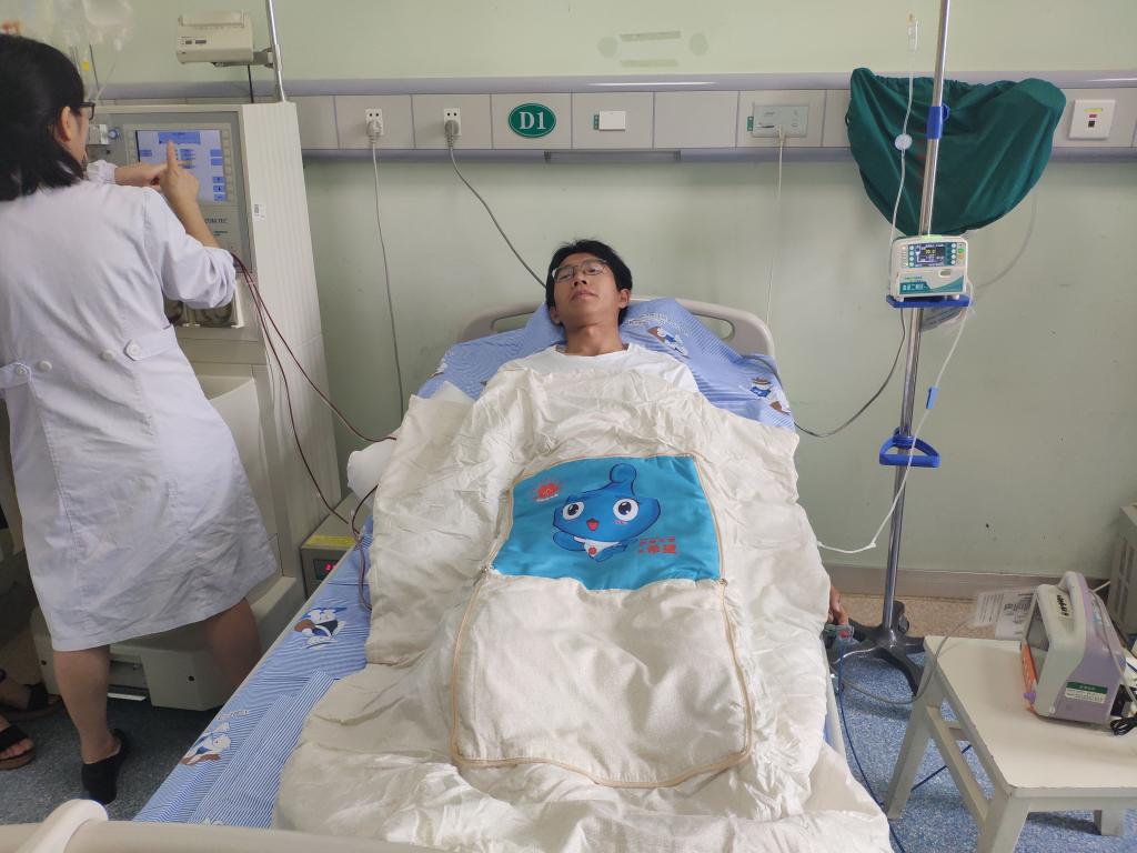 9月3日凌晨5:30,生物工程与食品学院17级生技1班的马徐枭注射完了最后一支动员剂。上午9点,当全血在体外循环4个小时后,终于采集够了200ml的造血干细胞。