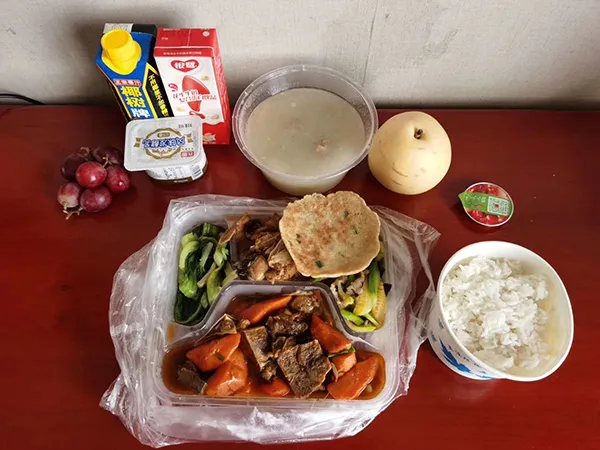 接下来,我们这些志愿者就进入了14天的隔离观察期。我们被安排在了东湖武汉特勤疗养中心,住的是单间,一日三餐由工作人员负责准备和配送,伙食非常好。比如,昨天的午餐有胡萝卜烧羊蝎子、红烧鱼块、清炒油麦菜、西葫芦烧肉、冬瓜老鸭汤,还有水果和椰汁。