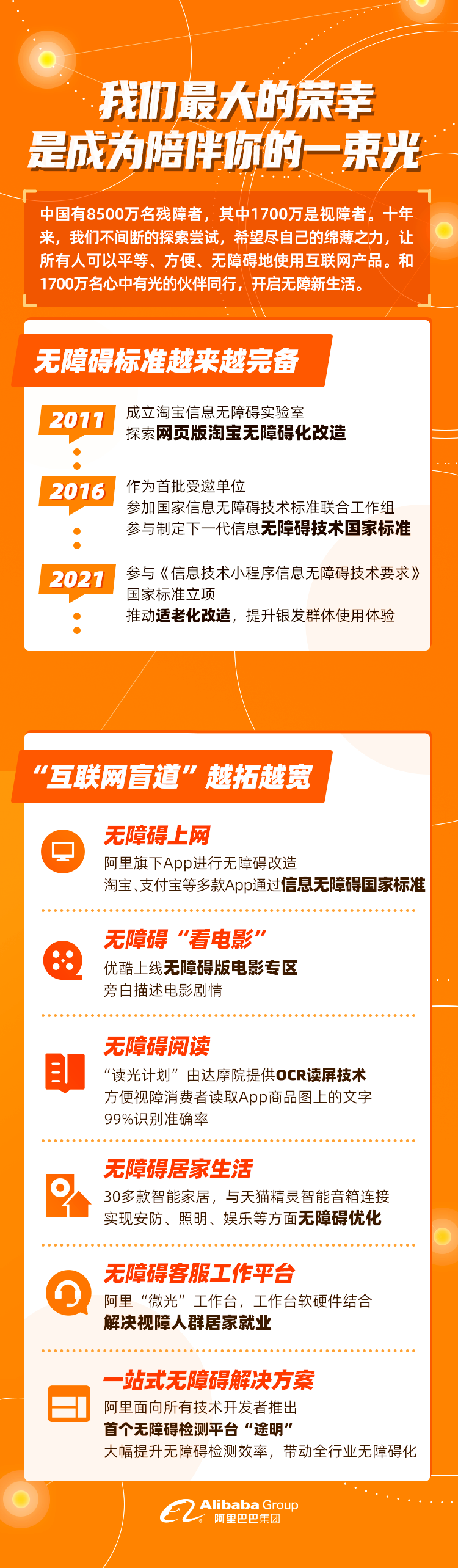 和他有一样心愿的还有阿里巴巴信息无障碍委员会,10年前,淘宝就在尝试网页版无障碍改造,来推动“互联网盲道”建设,阿里联动旗下全线产品,从出行、购物、生活和办公等多方面推动无障碍服务,让生活不便的人群也能无差别体验互联网生活。1700万视障人群可以“看电影”,可以读取图片文字,甚至可以通过阿里“微光”工作台实现在家就业。