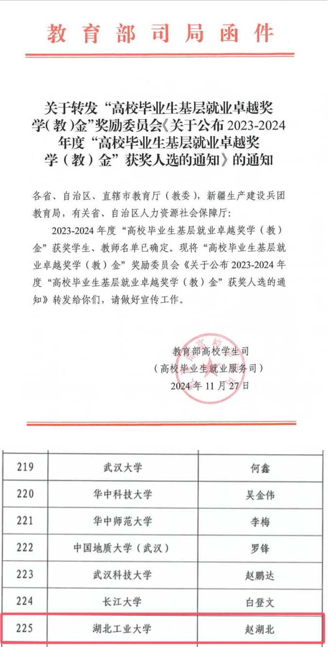 近日,由教育部高校学生司(高校毕业生就业服务司)与教育部学生服务与素质发展中心共同指导、中国教育发展基金会设立的“高校毕业生基层就业卓越奖学(教)金”2023-2024年度获奖人选名单公布,我校理学院2014届本科毕业生赵湖北获此殊荣,成为我校首位获得该项国家级荣誉称号的毕业生。
