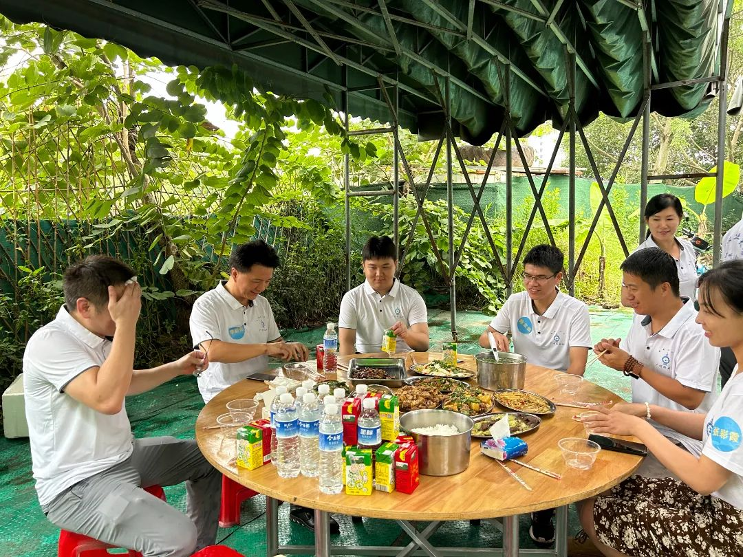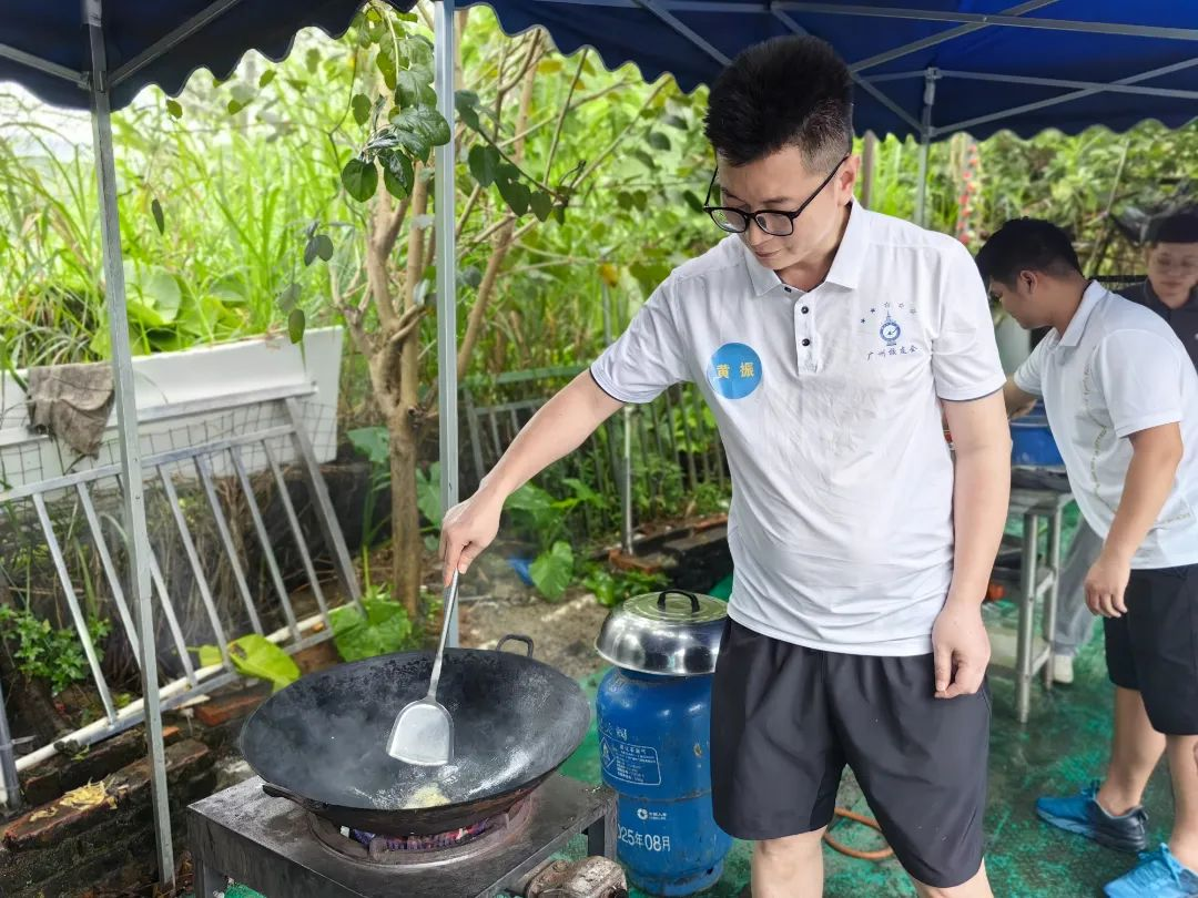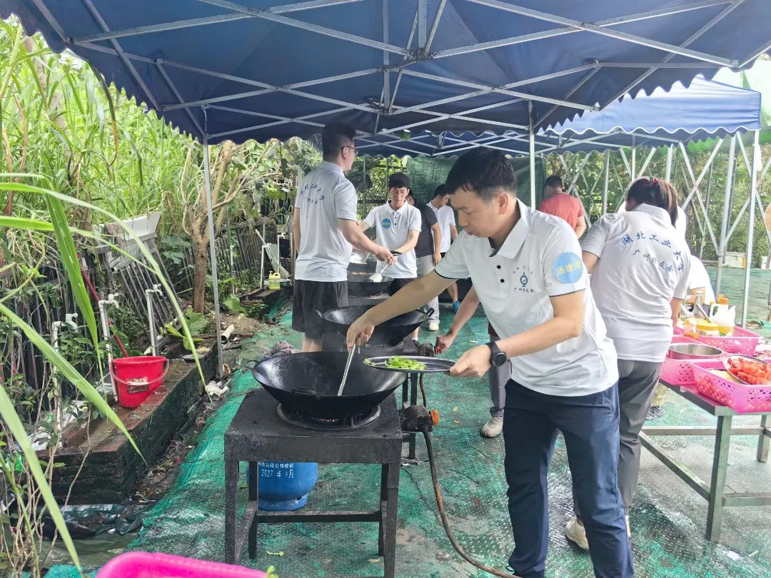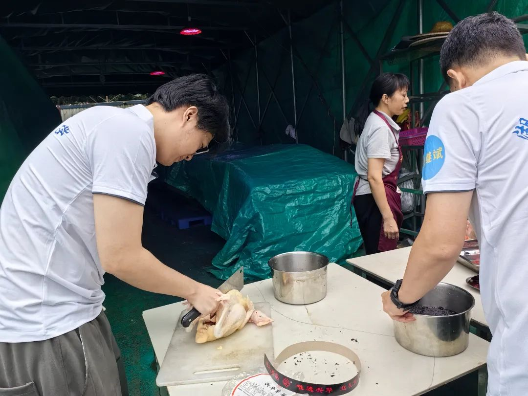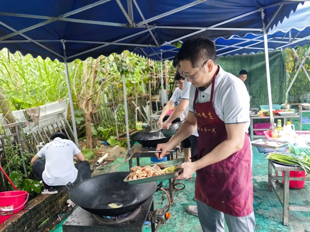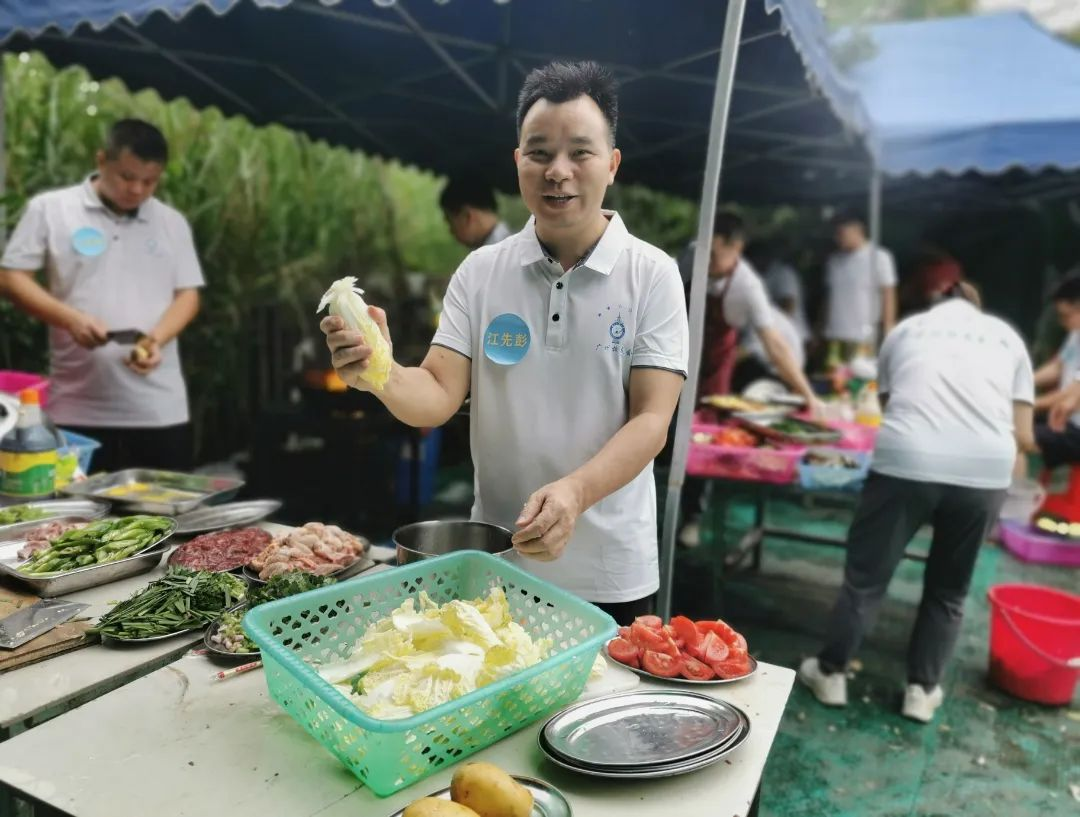 这次团建与其他不同,要吃饭需自己动手,也给了大家充分展示自我的机会。食材已备好备足,大家自由组合,分成三组。新老校友不分彼此,挽起袖子,切菜的切菜、炒菜的炒菜,井然有序、各展其长,有说有笑。