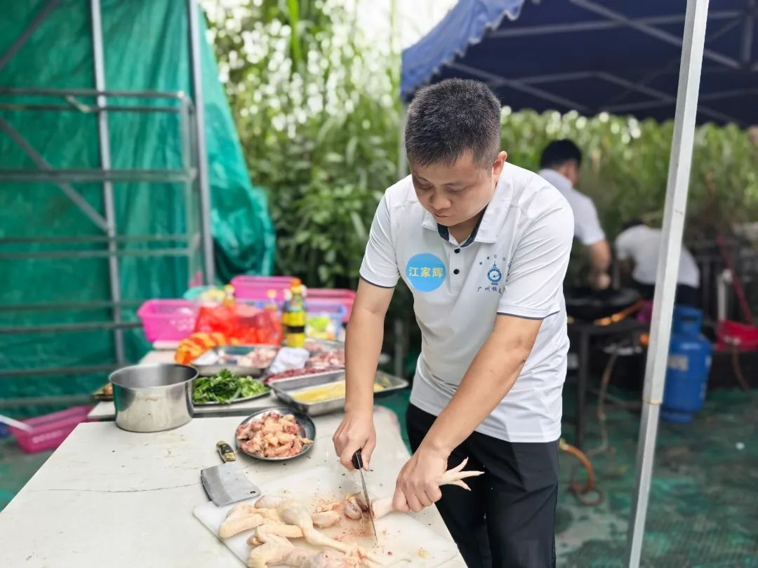 这次团建与其他不同,要吃饭需自己动手,也给了大家充分展示自我的机会。食材已备好备足,大家自由组合,分成三组。新老校友不分彼此,挽起袖子,切菜的切菜、炒菜的炒菜,井然有序、各展其长,有说有笑。